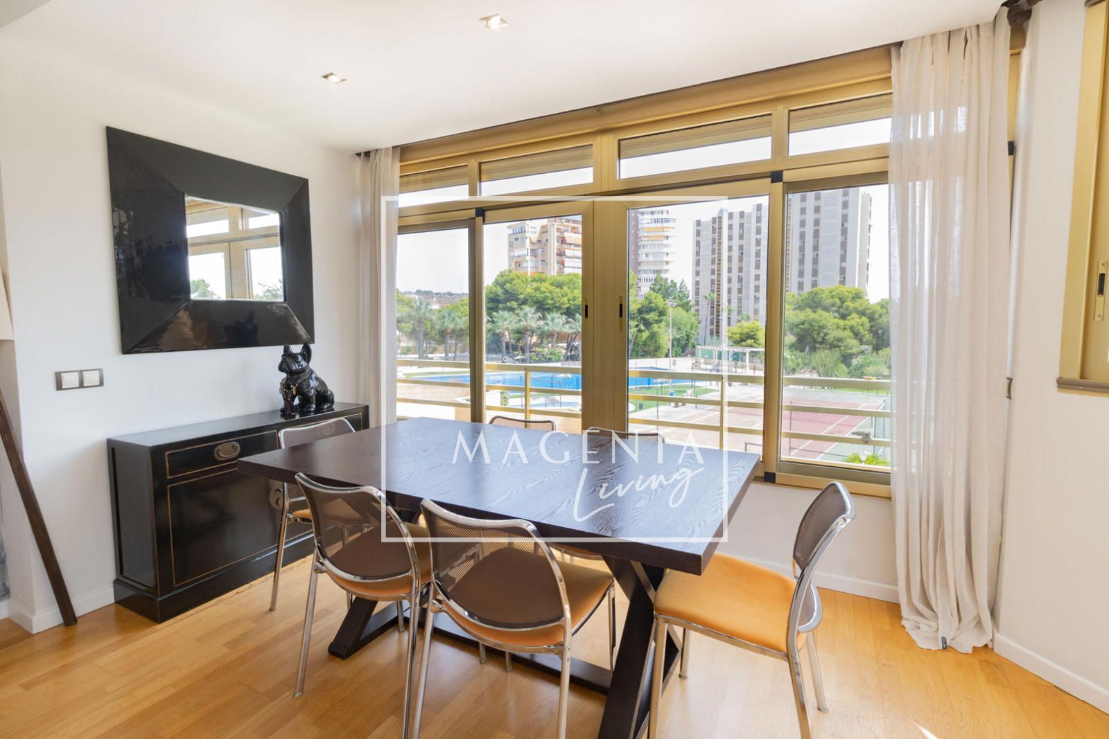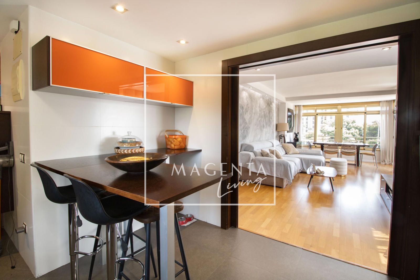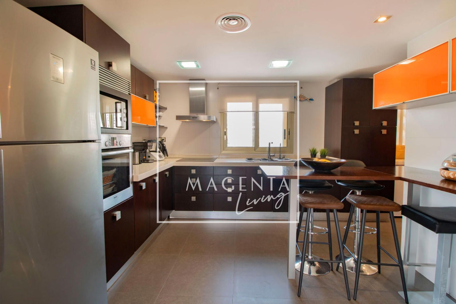 El salón y el comedor son muy luminosos y en ellos disfrutarás de vistas al mar. La cocina, abierta y equipada es un espacio agradable y funcional que dispone de puertas correderas en madera y cristal para independizar la estancia mientras se cocina. Un espacio de lavandería complementa la cocina y da acceso al aseo de invitados.